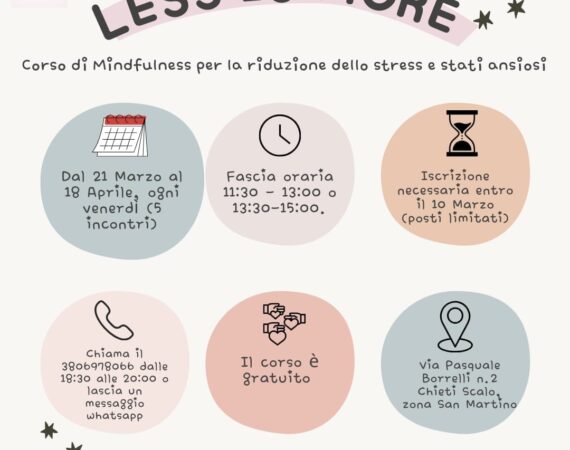 “In un mondo frenetico, imparare a rallentare e coltivare la consapevolezza è un atto di cura verso se stessi. Il corso ‘LESS IS MORE’ offre uno spazio per riconnettersi con il presente, ridurre l’ansia e sviluppare un atteggiamento più equilibrato nei confronti delle sfide quotidiane.“