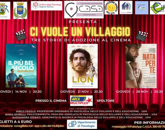 Il C.A.S.A. Centro di Ascolto e Servizi Assistenziali ETS, che da anni lavora sul territorio teatino con consulenze psicologiche gratuite ed eventi di formazione, propone una nuova attività di sensibilizzazione. Infatti, il Multiplex ARCA di Spoltore ospiterà a novembre “Ci vuole un villaggio. Tre storie di adozione al cinema”, cineforum dedicato al tema dell’adozione con tre proiezioni in programma: Il più bel secolo della mia vita (14 novembre alle 20:30), Lion – La strada verso casa (21 novembre alle 20:30) e Nata per te (28 novembre alle 20:30).